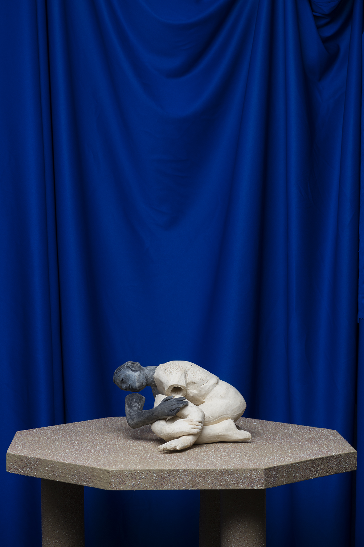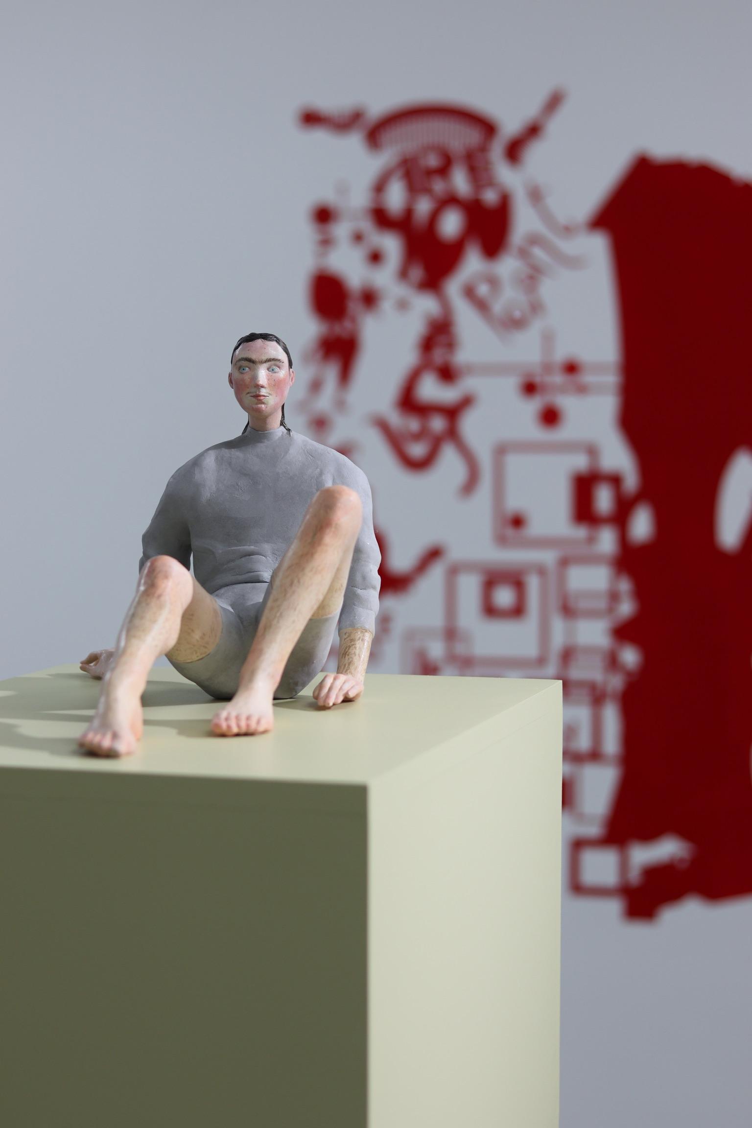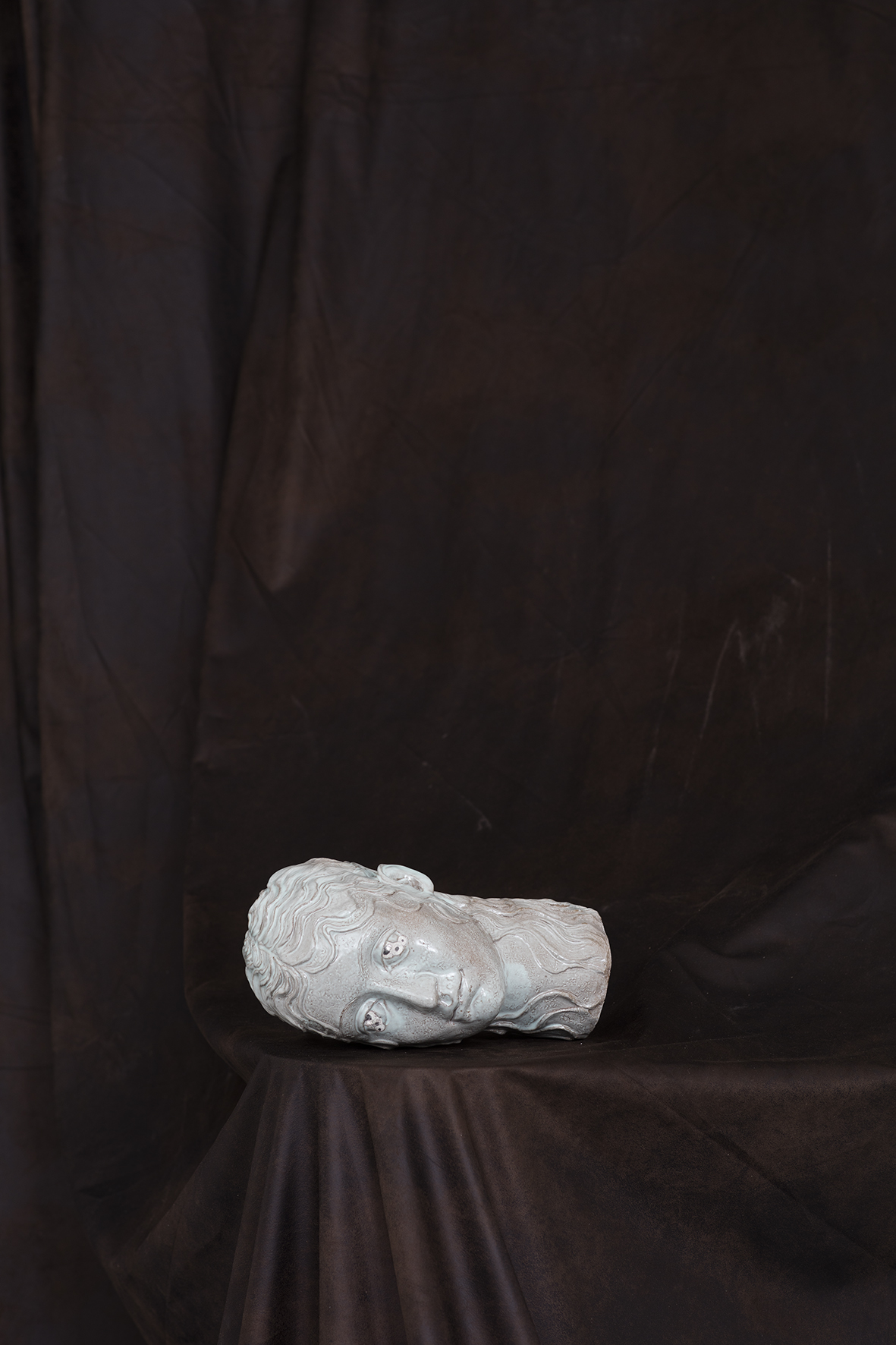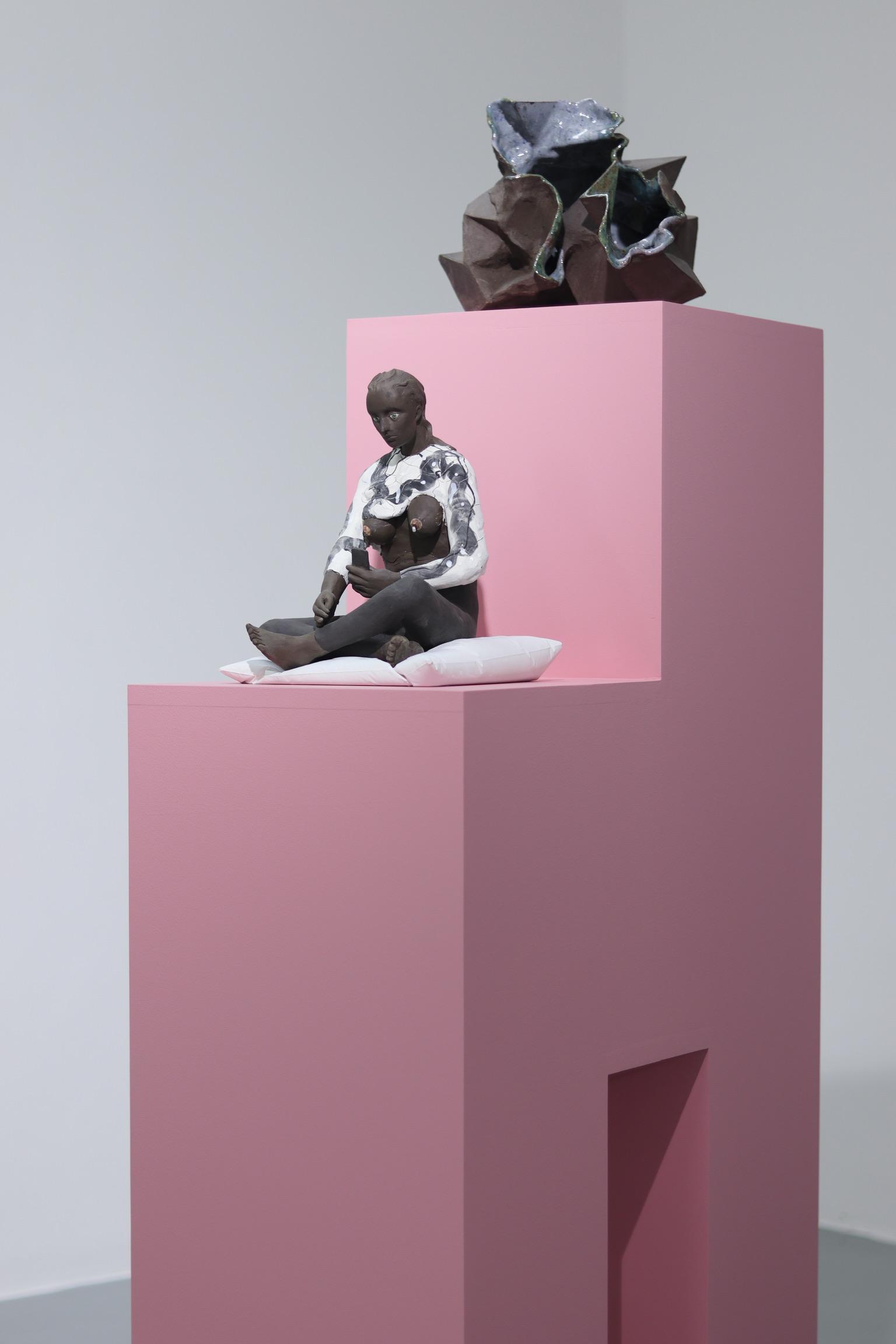 Sabine, 2025, ceramics, 30 x 40 cm; pedestal 135 x 55 x 40 cm; print on textil 300 x 150 cm